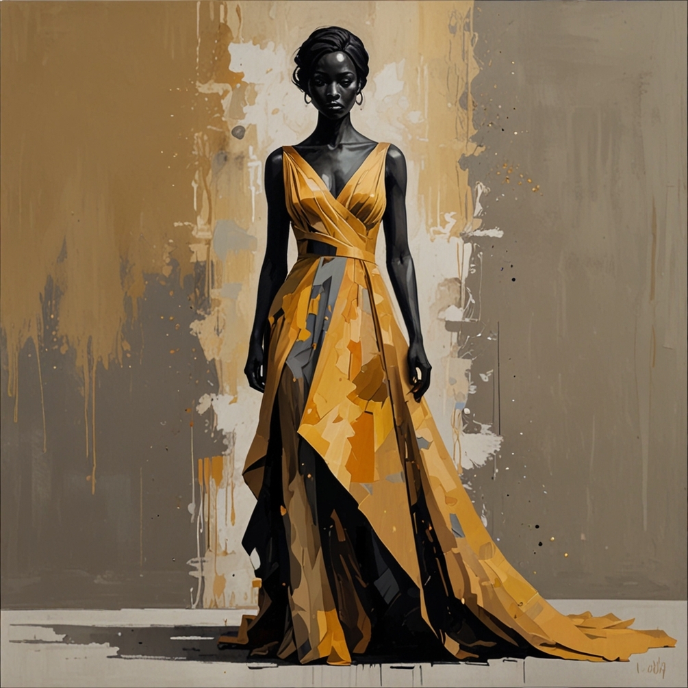 “Drift of Elegance” is an enchanting abstract painting that captures the graceful silhouette of a woman in a flowing gown. The gown seamlessly melds into the textured background, featuring rich, cascading brushstrokes in shades of gold, yellow, grey, and black. The upper part of the artwork showcases soft, muted beige tones adorned with subtle geometric patterns, creating a sophisticated contrast. This piece is imbued with a sense of motion, as if the gown is drifting and blending with its surroundings. The modern, contemporary art style highlights the beauty of fluidity and elegance, making it a striking addition to any collection. Dimensions are 1024x1024 px